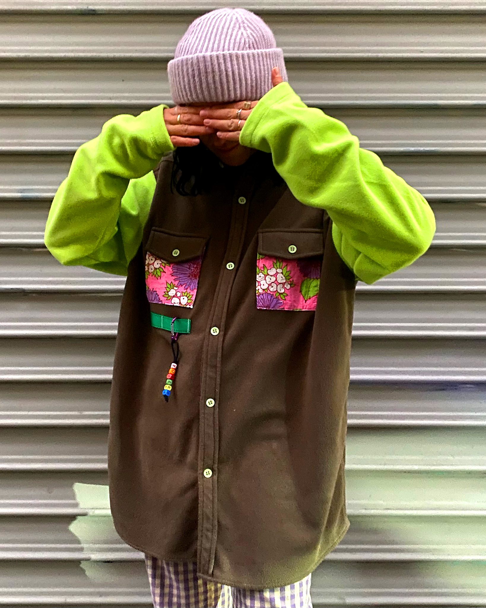 Polère puise dans l’héritage des années 90 depuis sa création : mousquetons, chaînes, perles, polaire, multi- poches composent ses vêtements ludiques réalisés à partir de tissus recyclés.