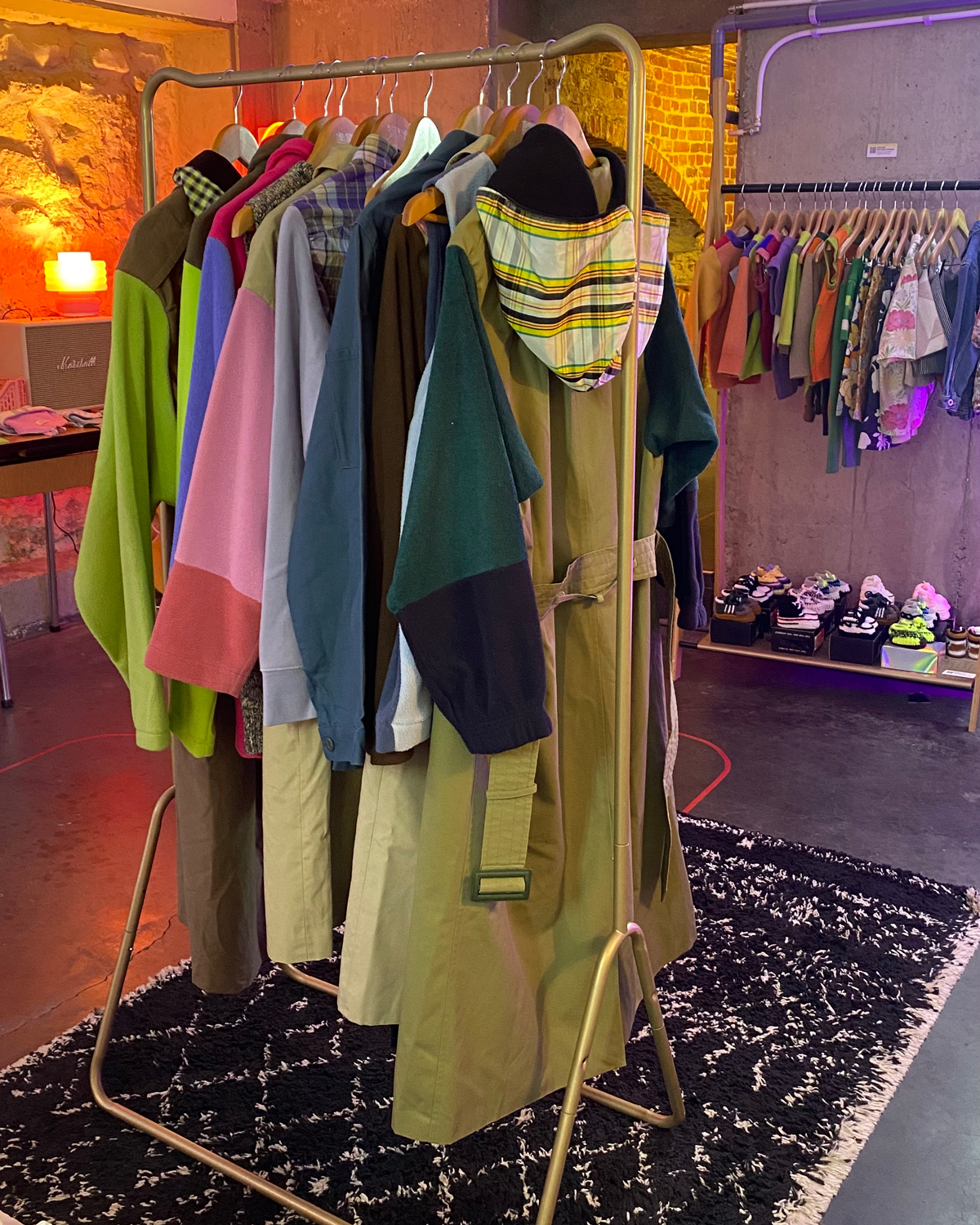 Polère puise dans l’héritage des années 90 depuis sa création : mousquetons, chaînes, perles, polaire, multi- poches composent ses vêtements ludiques réalisés à partir de tissus recyclés.
